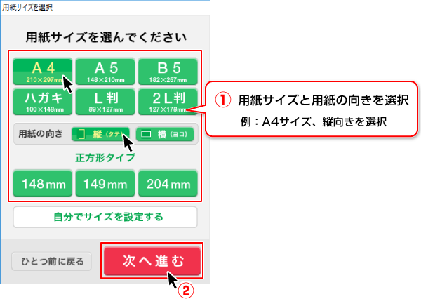 「自分でサイズを設定する」ボタンをクリックして用紙サイズを設定してください。
