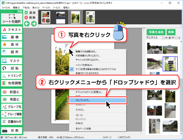 ②表示される右クリックメニューから「ドロップシャドウ」を選択します。