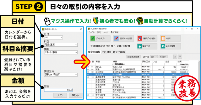 かんたんな操作で毎日の取引内容を短時間ですぐに入力することができます。