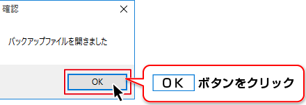 「バックアップファイルを開きました」と表示されます。OKボタンをクリックします。