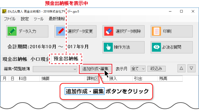 預金出納帳画面で 追加作成・編集ボタンをクリックします。