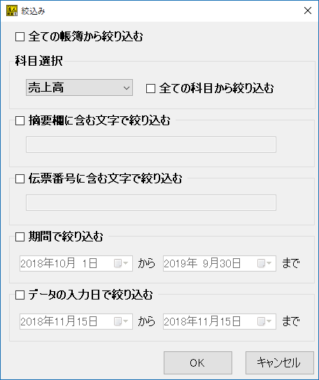 - チェックを入れると、全ての帳簿から設定した条件にあてはまるデータを絞り込みます。