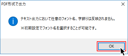 「PDF形式で出力」画面で、テキスト出力についての注意内容が表示されますので、