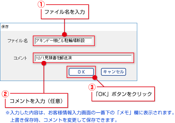 保存画面のリストにファイル名/会社名/コメント/保存日時が追加され、帳票データを保存できました。