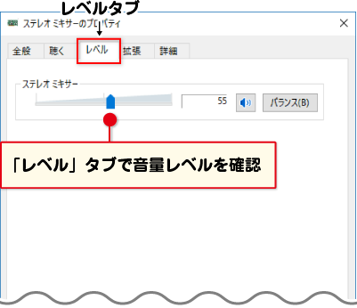 3:該当デバイスのプロパティ画面の音量レベルや各項目等をご調整の上、改めて録画をお試しいただけますと幸いです。(図例:ステレオミキサーのプロパティ画面)