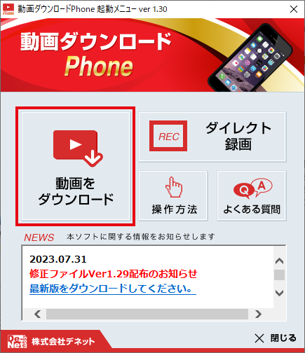 動画ダウンロード Phoneを起動すると、下記のような起動メニュ―が表示されます。 「動画をダウンロード」ボタンクリックします。