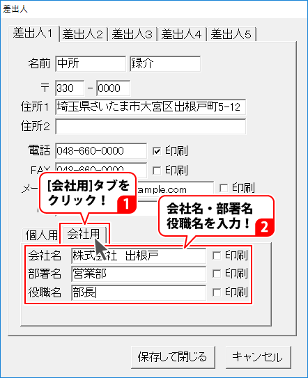 [会社用]タブをクリックして、会社名、部署名、役職名を入力します。