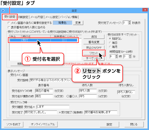 「受付設定」タブの受付リストから、リセットする受付名を選択してリセットボタンをクリックします。