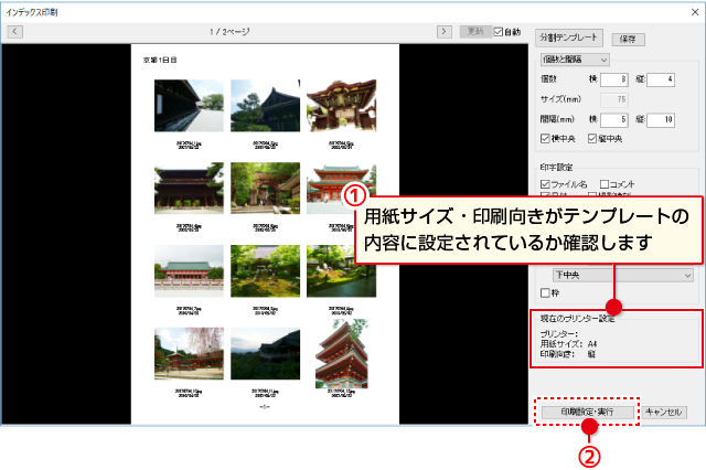| チェックを入れると、写真の下にファイル名が印字されます。 | |