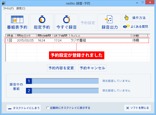 予約設定が登録されますと、予約一覧に予約設定が表示されます。 ※録音中はパソコンおよび本ソフトを起動したままにしておいてください。