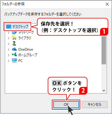 バックアップの保存先を選択して、OKボタンをクリックします。