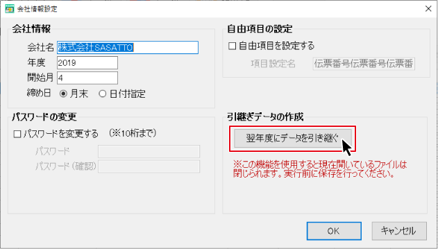 会社情報設定画面が表示されますので、翌年度にデータを引き継ぐボタンをクリックします。