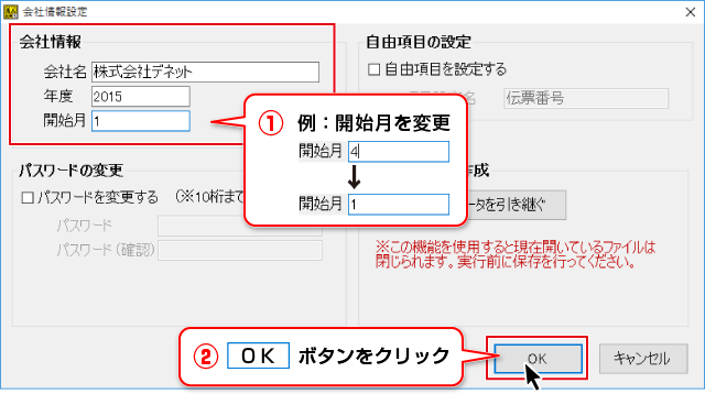 ※年度・開始月を変更の際、会計期間外のデータが存在している場合は変更ができません。
