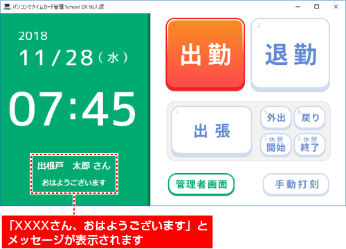 「XXXXさん、おはようございます」とメッセージが表示されましたら、正常に出勤が記録されています。