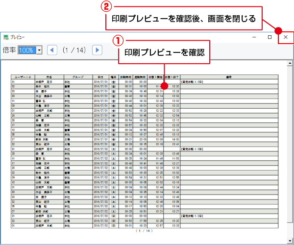 ①検索された勤怠データは、「勤怠データ一覧」の各項目(ユーザーID~出勤時刻など)を