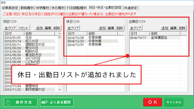 この画面は会社指定休日や、特別出勤日などのリストを設定します。