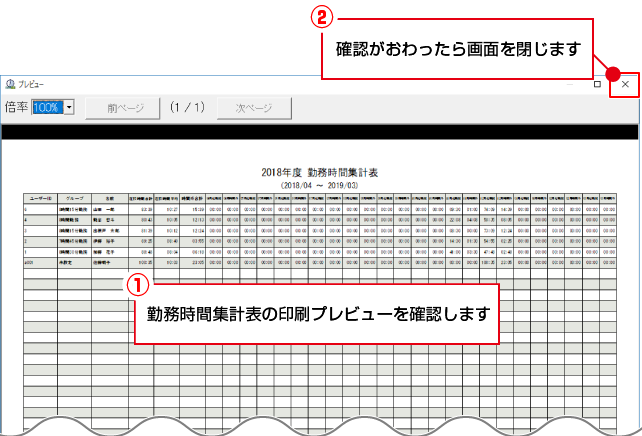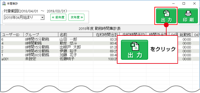 集計画面でボタンをクリックして、年間勤務時間集計画面を表示します。