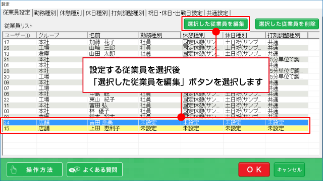 【 必須設定項目:勤務種別 / 休憩種別 / 休日種別 / 打刻調整種別 / 集計設定を各従業員に設定する 】