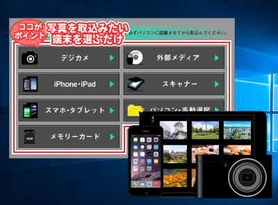デジカメなどの 機器をパソコンに接続し 該当する機器を選ぶだけでソフトが写真が入っているフォルダーを表示。